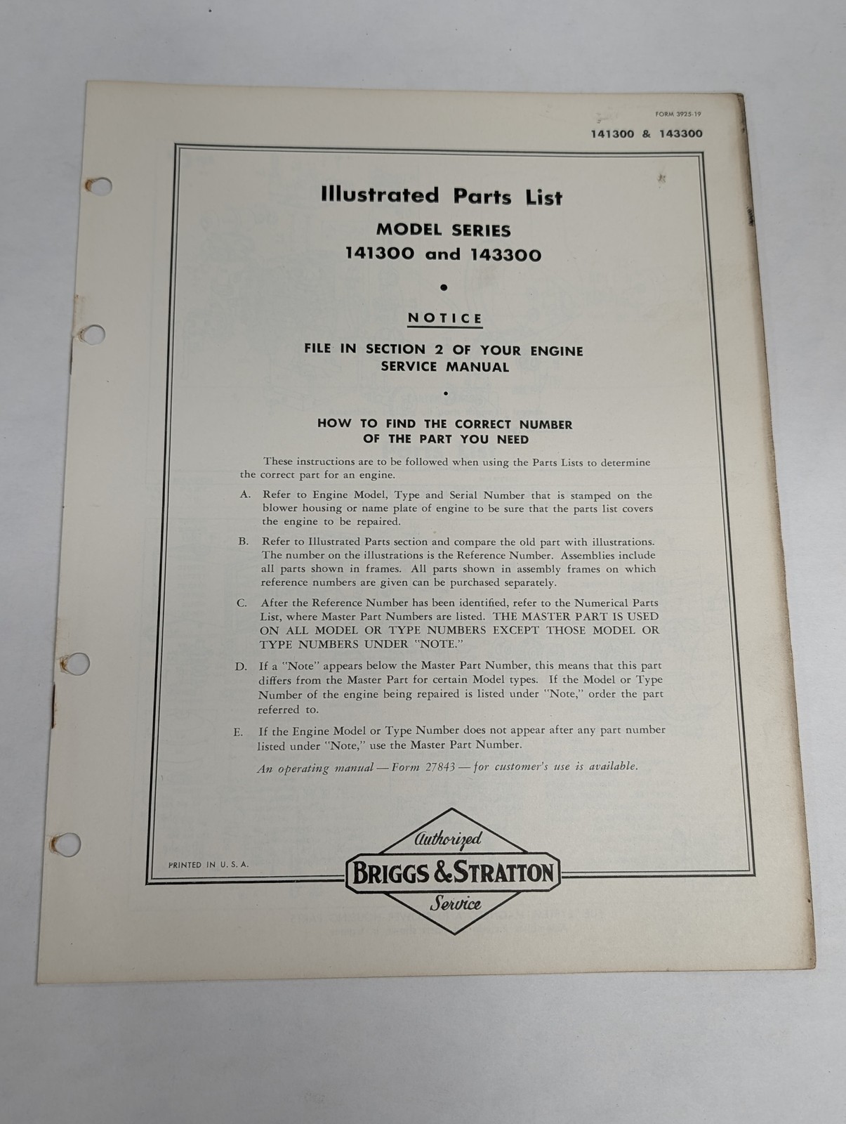 Briggs & Stratton Illustrated Parts List Catalog Model Series 141300 143300