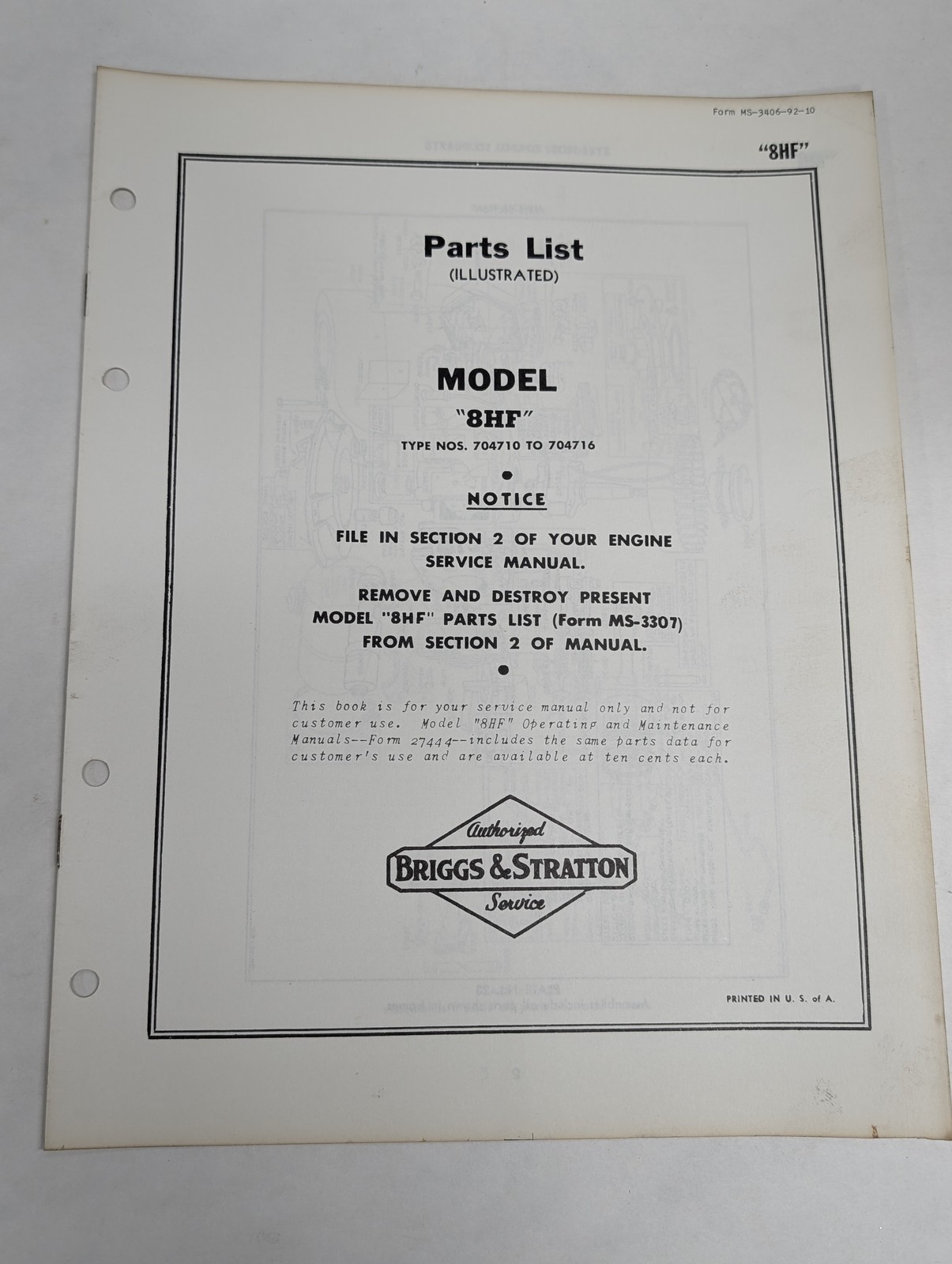 Briggs & Stratton Illustrated Parts List Catalog Model Series 8Hf