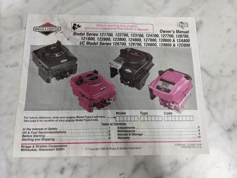 Briggs & Stratton Owner’S Manual 1989 1993 121700 122700 129800 12D800 126700