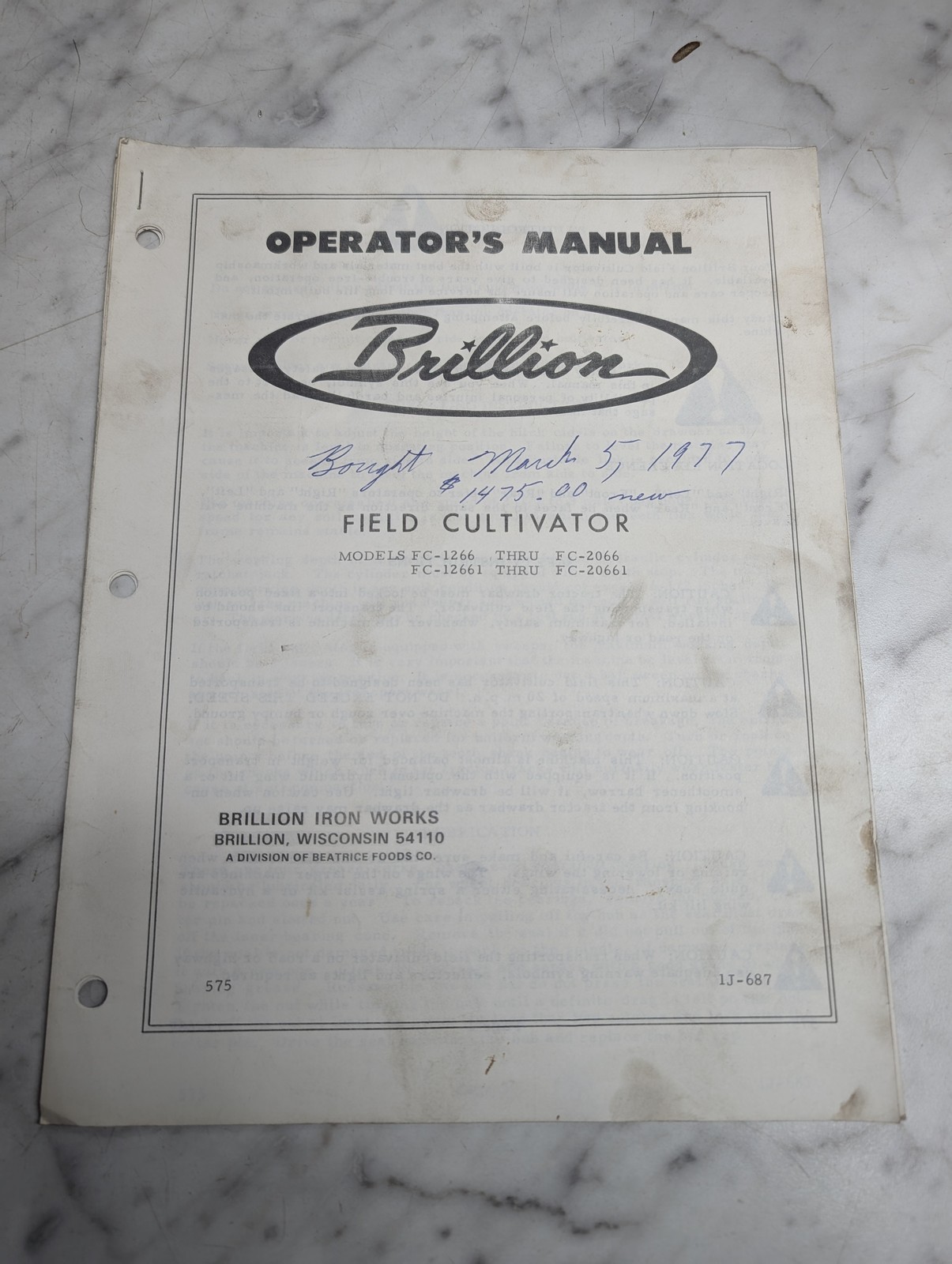 Brillion Operator’S Service Maintenance Manual Field Cultivator Fc 1266 2066