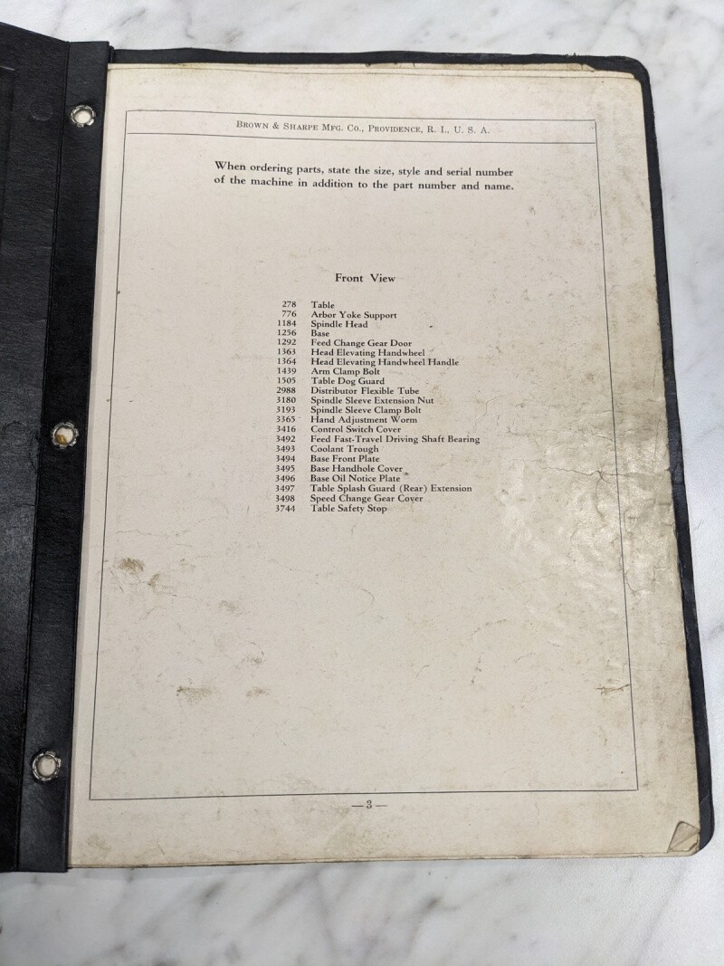 Brown & Sharpe Repair Part List Manual Catalog #12 Milling Machine