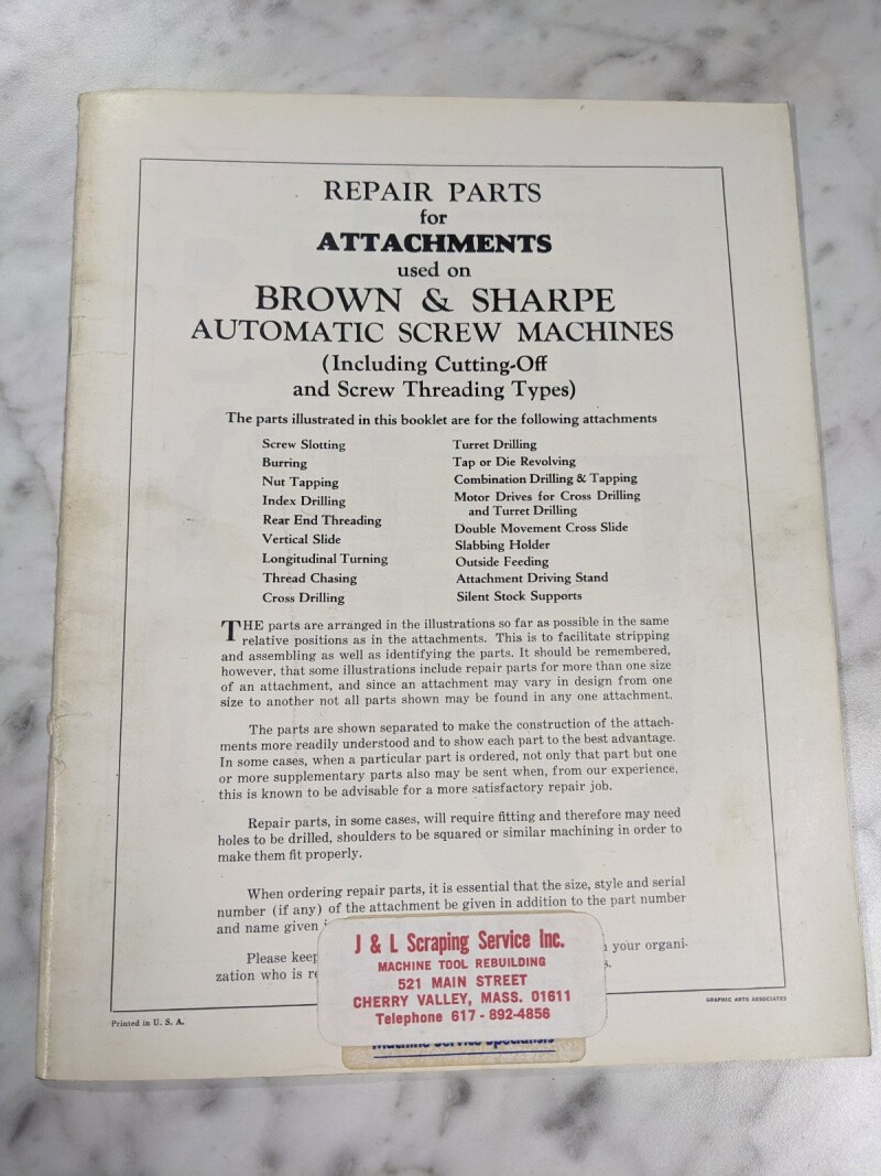 Brown & Sharpe Repair Parts List Manual Catalog Attachments Auto Screw Machine