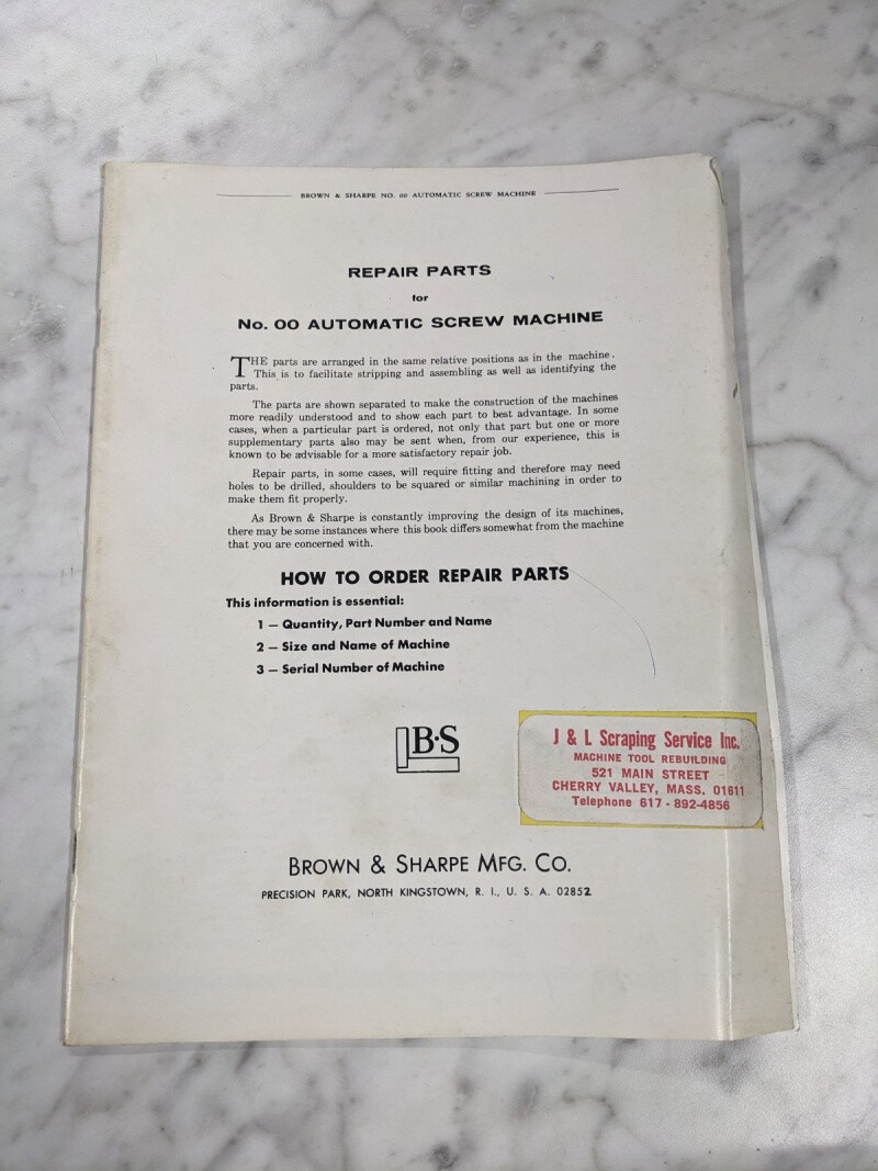 Brown & Sharpe Repair Parts List Manual Catalog #Oo 00 Auto Screw Machine