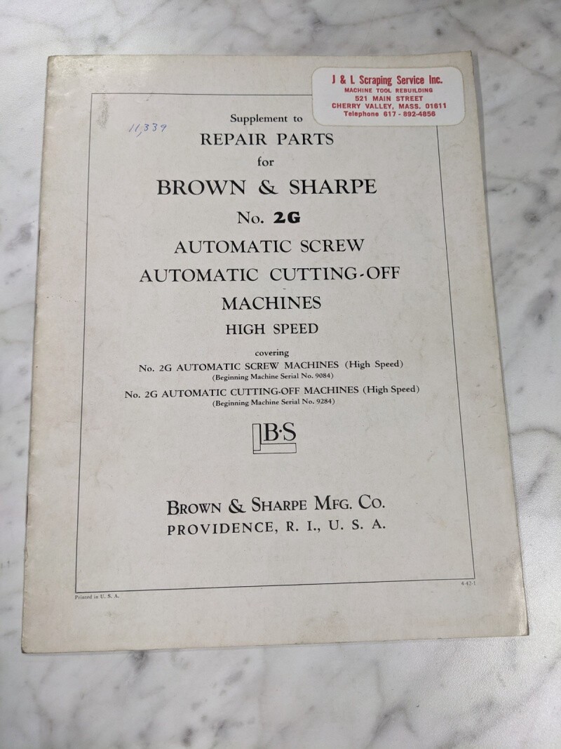 Brown & Sharpe Supplement Repair Parts List Manual #2G Auto Screw Machine 1942