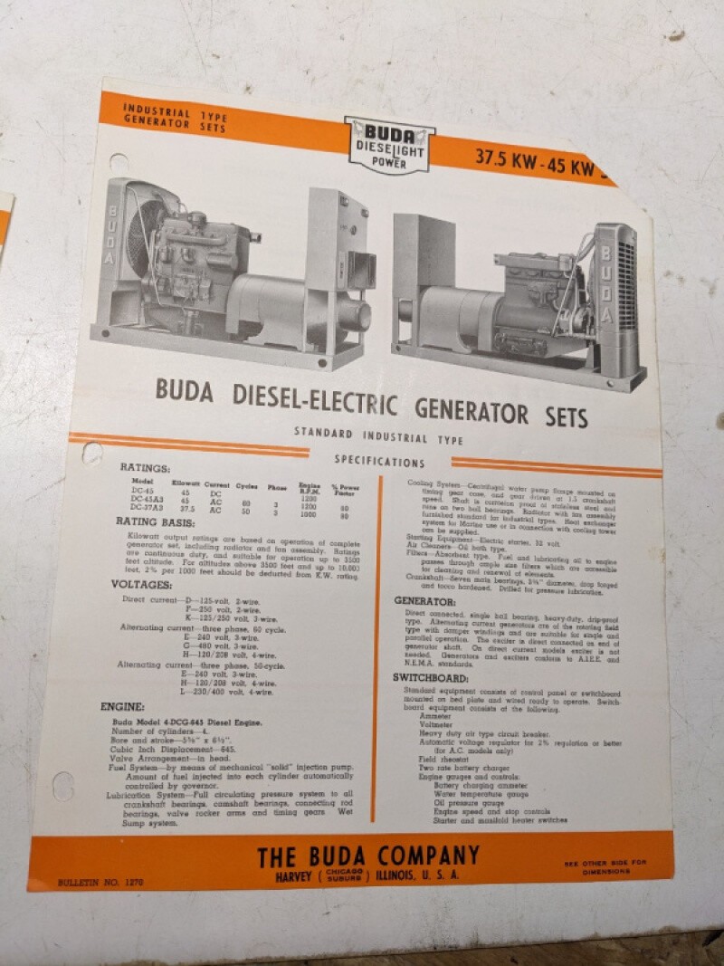 Buda Diesel Electric Generator Sets Specifications Sales Brochure 1948 37.5-45Kw