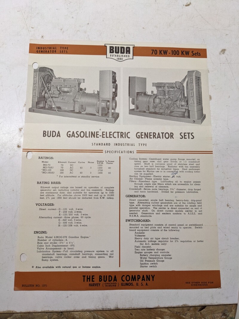 Buda Gasoline Electric Generator Set Specifications Sales Brochure 1947 70-100Kw