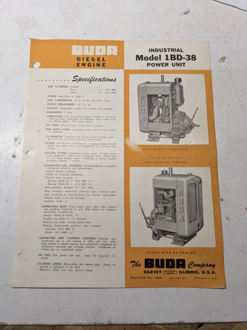 Buda Industrial Diesel Power Unit Specifications Sales Engine 1Bd-38 1948