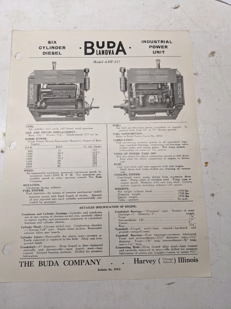 Buda Industrial Diesel Power Unit Specifications Sales Engine 6-Dt-317 1948