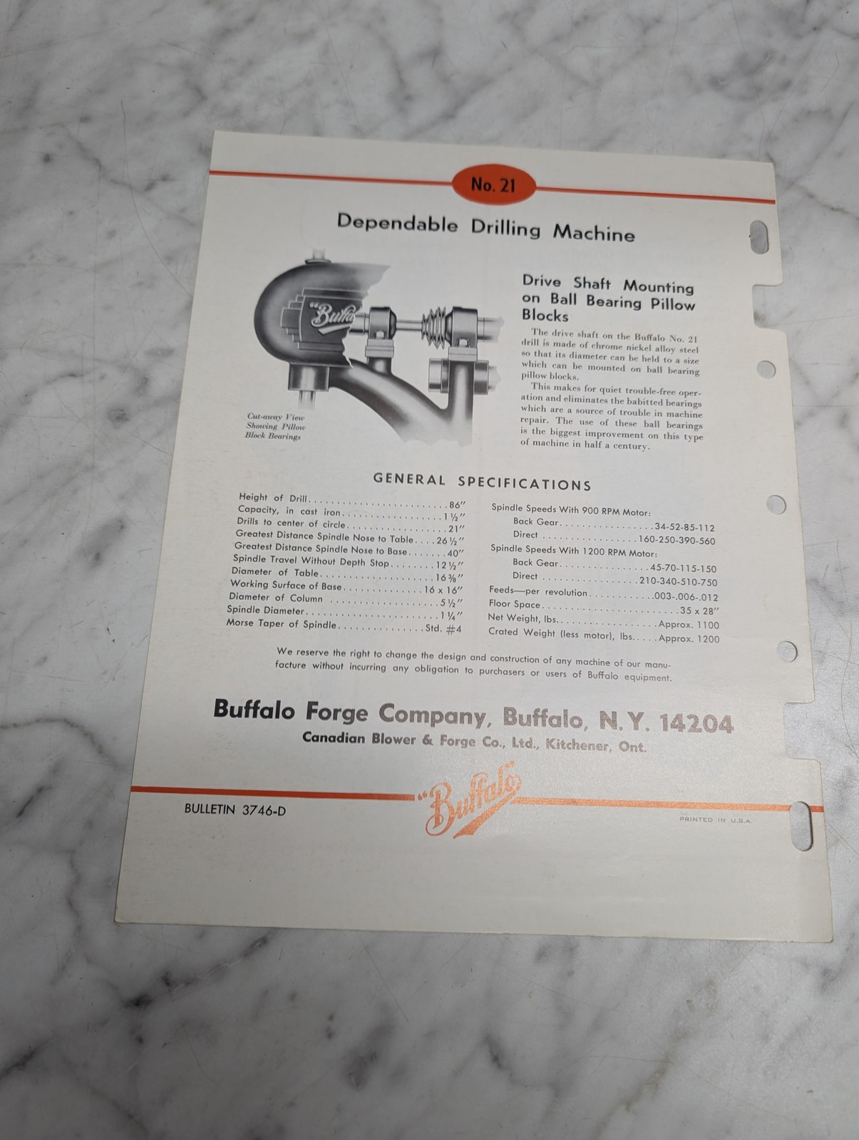 Buffalo #21 Back Geared 8 Speed Drilling Machine Bulletin 3746 D Sales Brochure