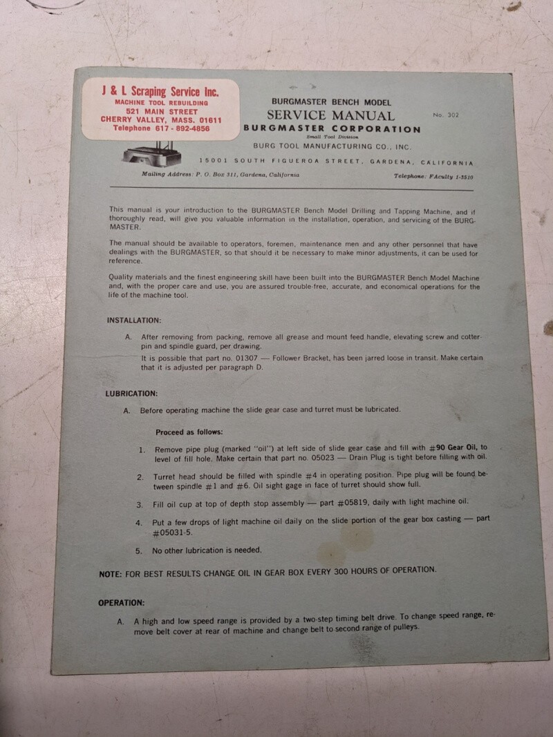 Burgmaster Service Manual Drilling Tapping Machine Model Bench 302 Parts List