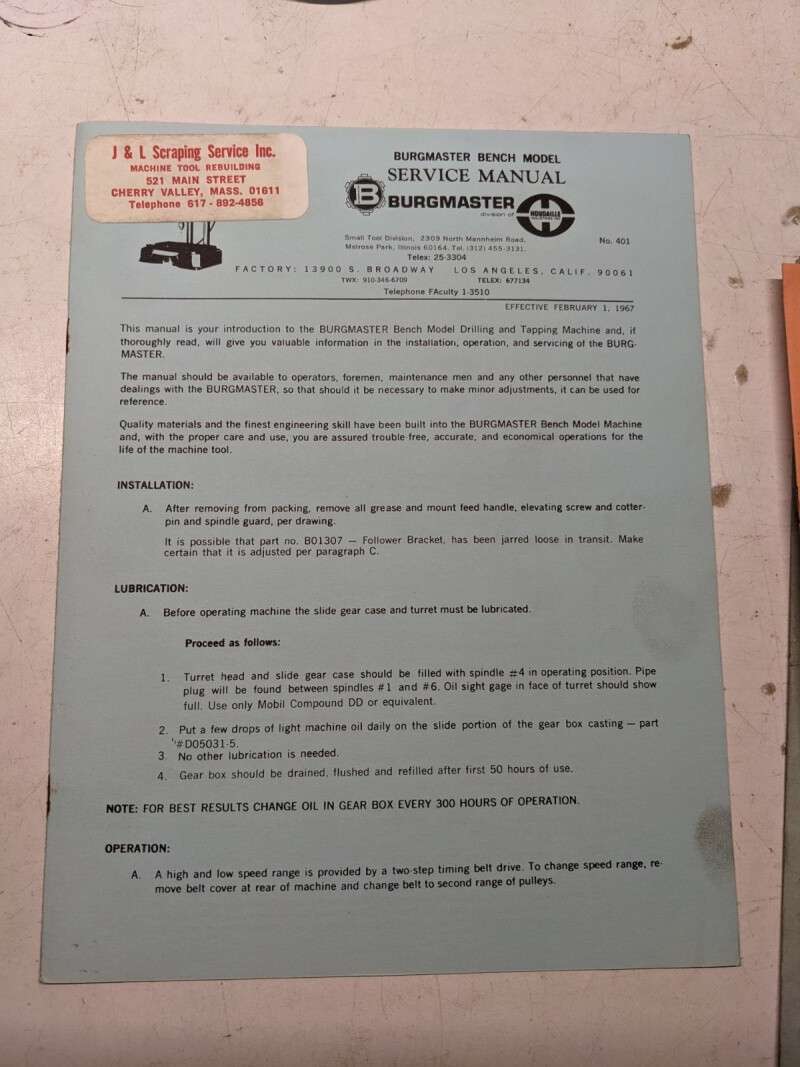 Burgmaster Service Manual Drilling Tapping Machine Model Bench 401 Parts List