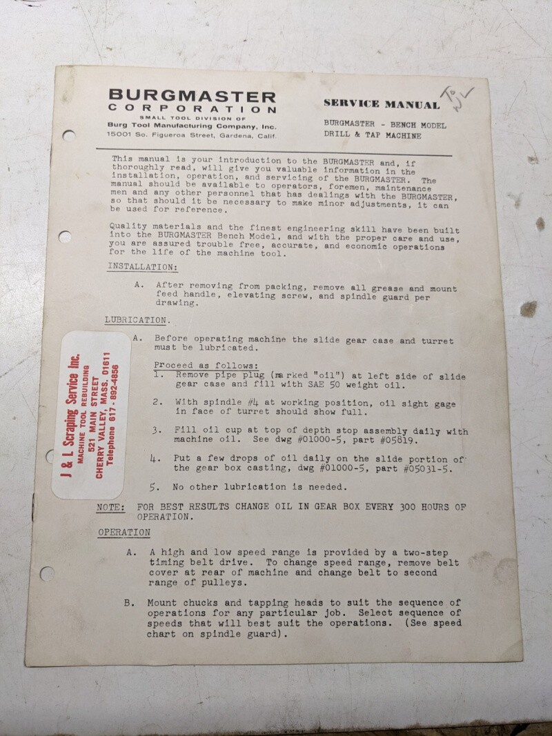 Burgmaster Service Manual Drilling Tapping Machine Model Bench Parts List