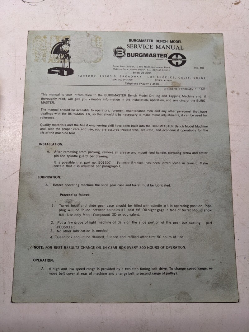 Burgmaster Service Manual Drilling Turret Machine Model Bench Parts List 2/1967