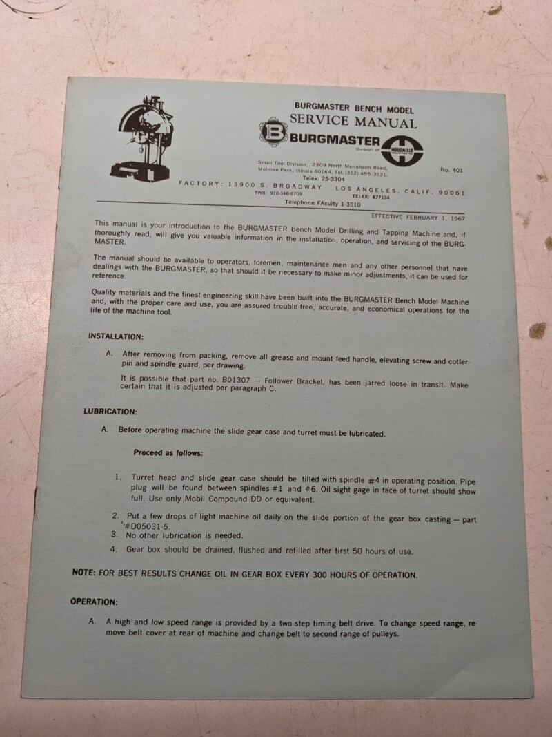 Burgmaster Service Manual Drilling Turret Machine Model Bench Parts List 401