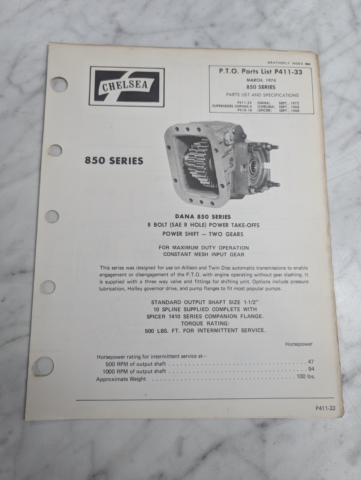 Chelsea Dana Repair/Service Parts List Catalog Manual 850 Series P411-33 1974
