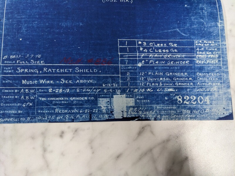 Cincinnati Grinder Company Ratchet Shield Spring Print Diagram Drawing 1948
