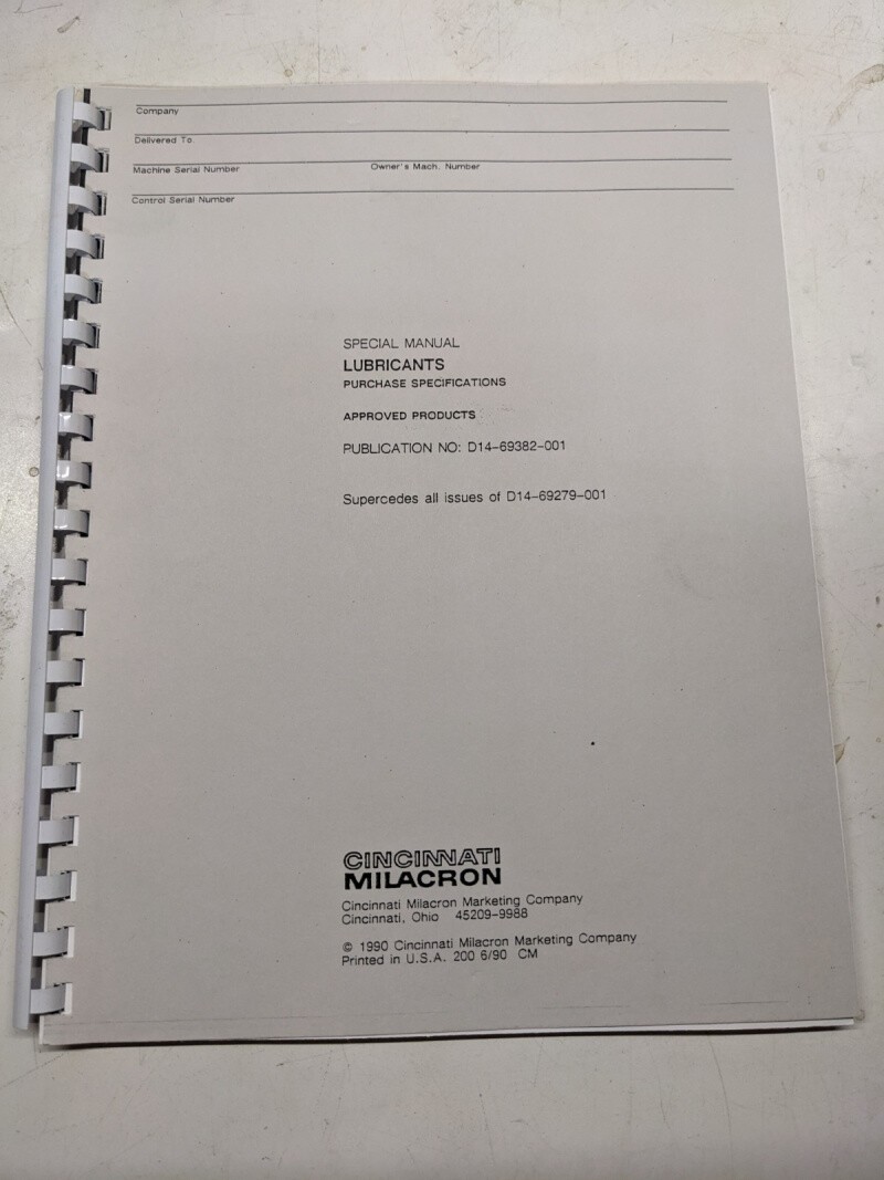 Cincinnati Milacron Special Manual Service Maintenance Lubricants Specifcations