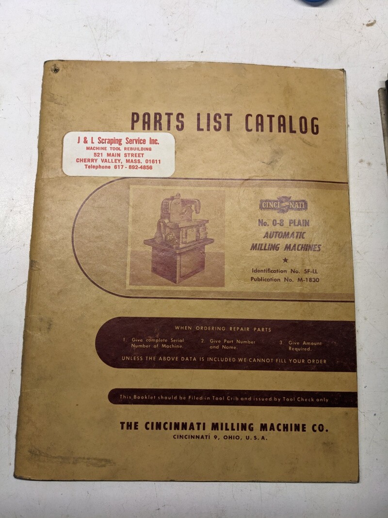 Cincinnati Milling Machine Parts List Book Manual Catalog #0-8 5F-Ll M-1830 1955