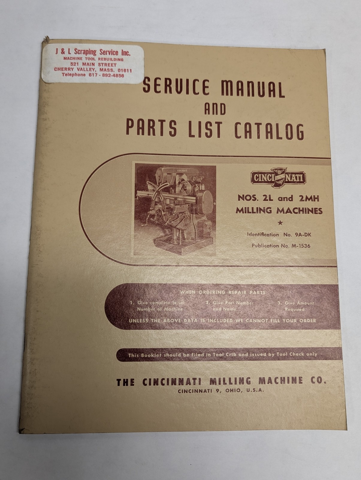 Cincinnati Milling Machine Service Manual Parts List Catalog 2L 2Mh 9A-Dk