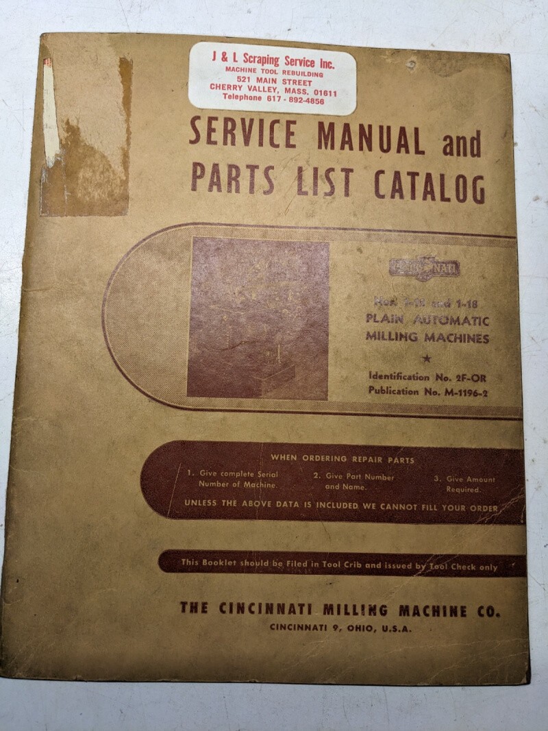 Cincinnati Milling Service Manual Parts List Catalog Book #1-12 1-18 2F-Or 1942