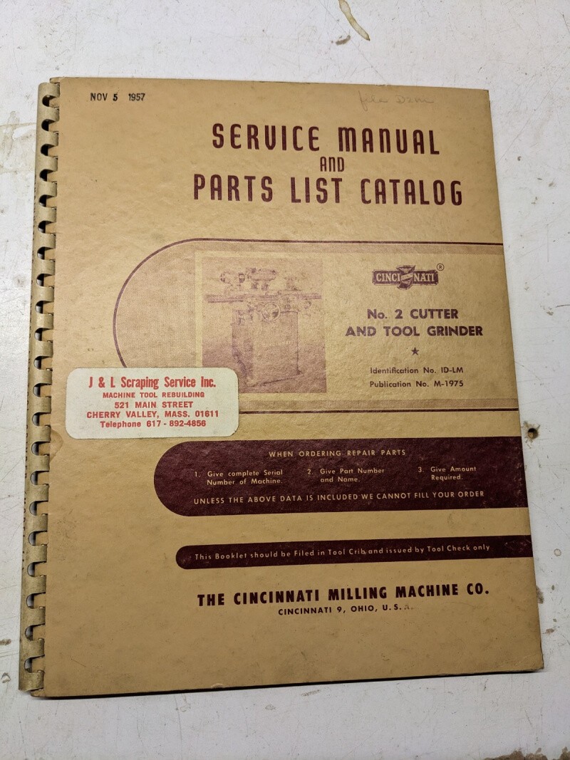 Cincinnati Operator Service Manual Part List Catalog #2 Cutter Tool Grinder 1957