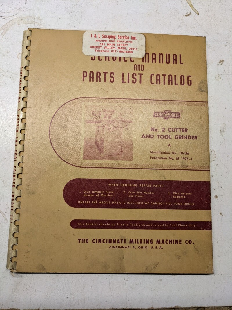 Cincinnati Operator Service Manual Parts List Catalog #2 Cutter Tool Grinder