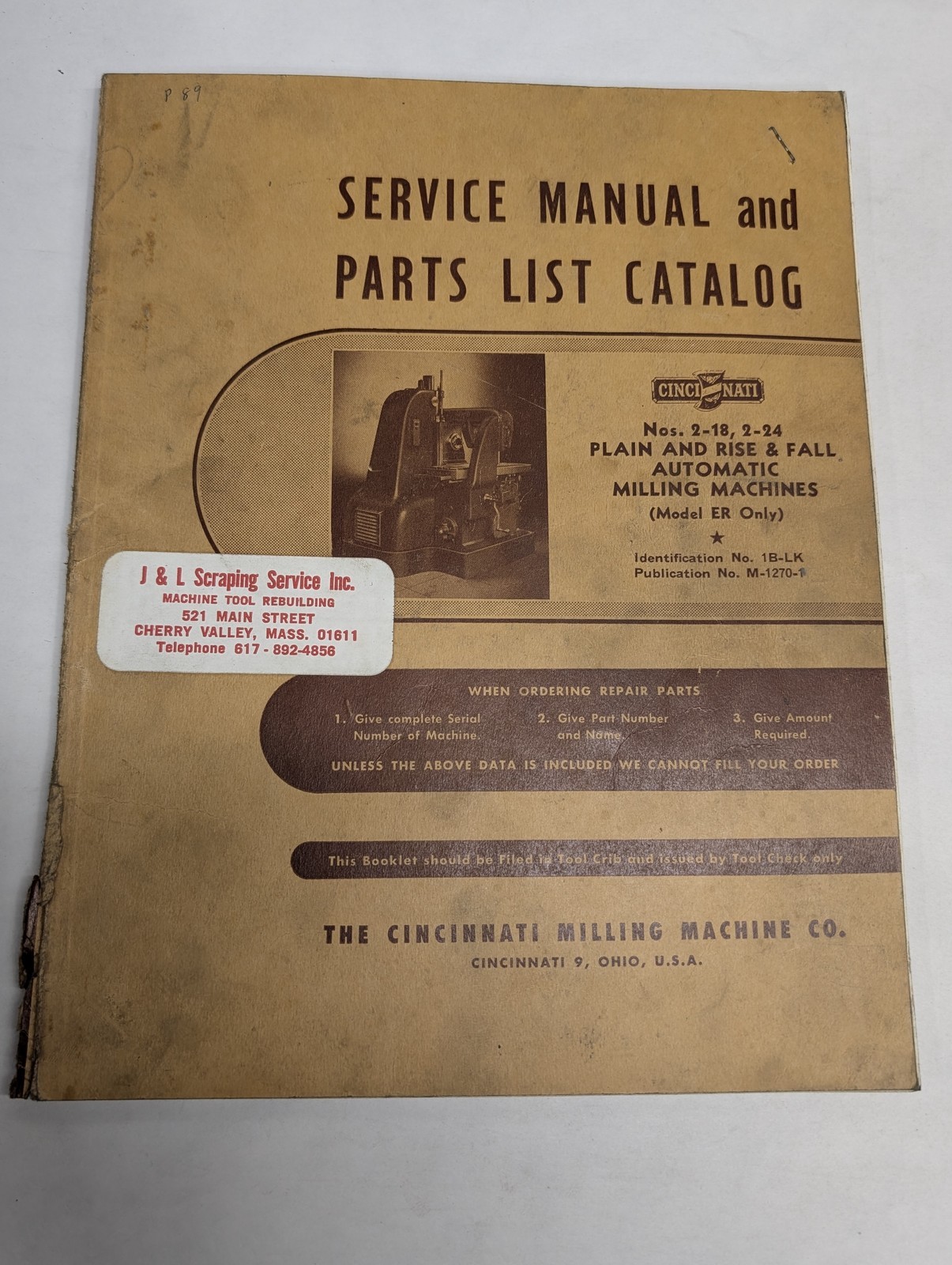 Cincinnati Parts List Service Repair Manual Auto Milling Machine 2-18 2-24 Er