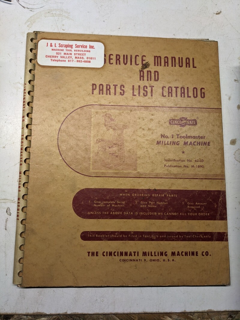 Cincinnati Service Manual Repair Part Catalog #1 Toolmaster Milling Machine 1956