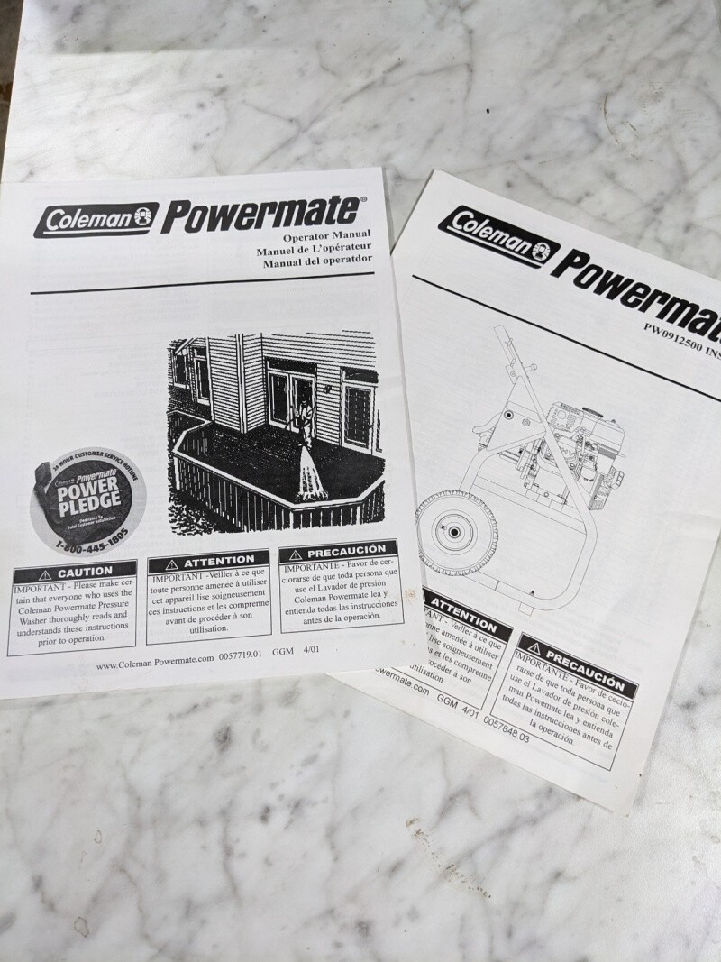 Coleman Powermate Operator Service Manual & Insert Power Washer Pw0912500