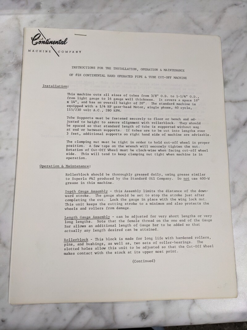 Continental Machine Instruction Operator Service Manual 1H Pipe Tube Cut Off