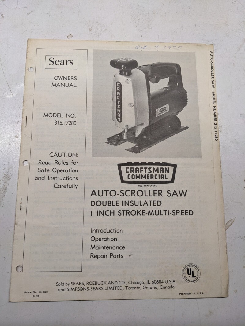 Craftsman Sears Owners Manual Parts List Model 315.17280 Saw 1975 En-621