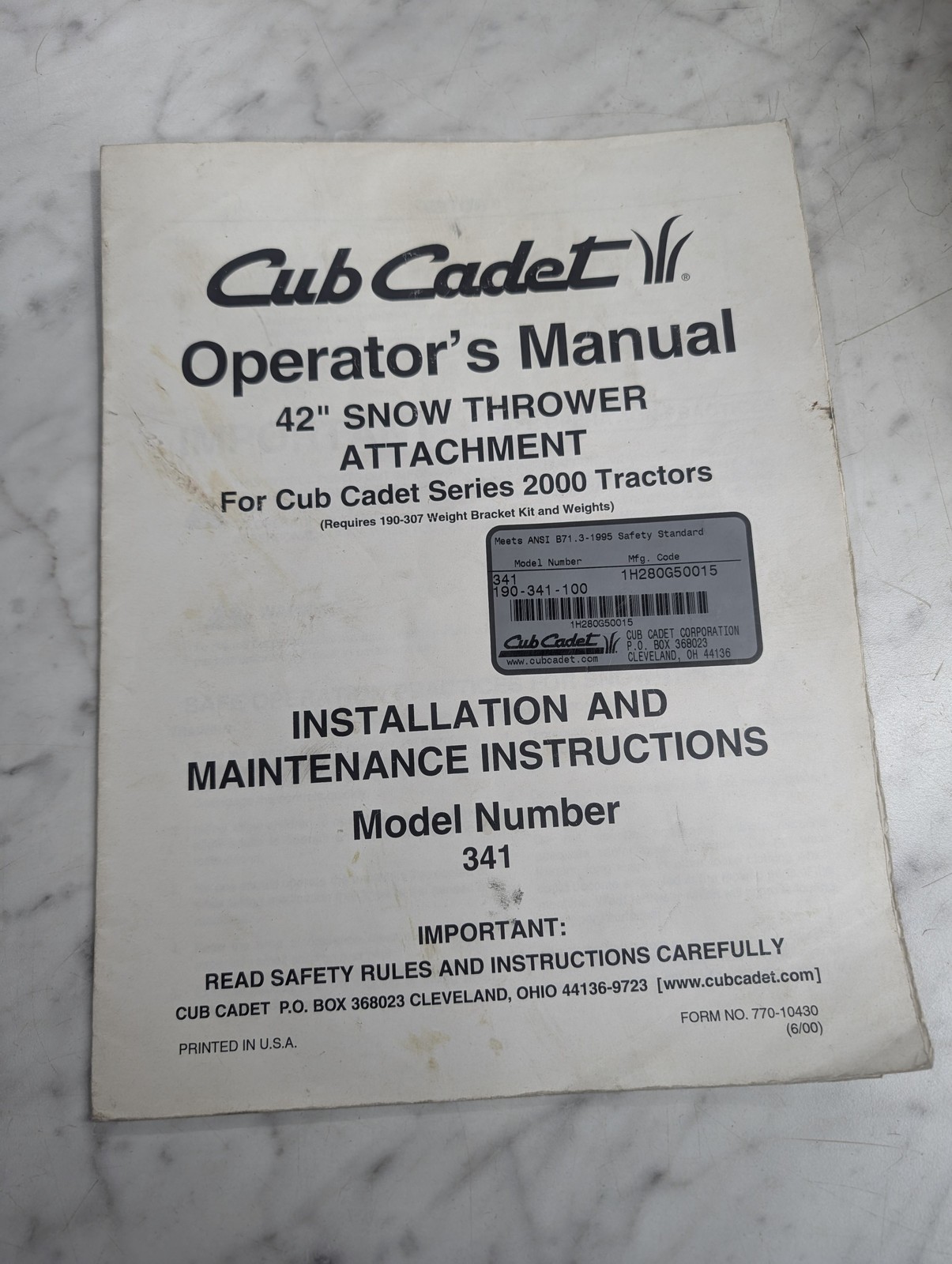 Cub Cadet Operator’S Manual 42” Snow Thrower Attachment 341 (2000 Tractor)