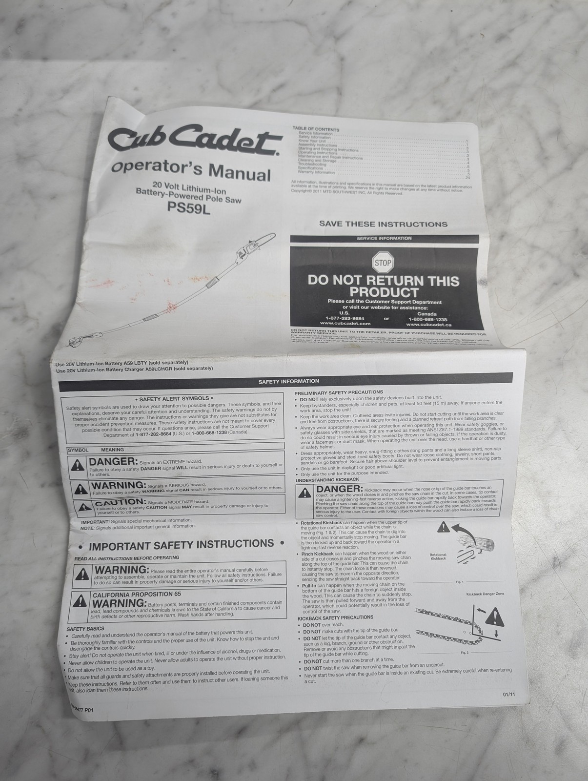 Cub Cadet Operator’S Service Manual Book Ps59L 20 Vdc Pole Saw Battery Powered