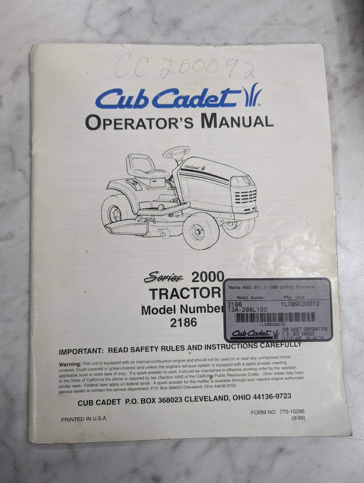 Cub Cadet Owner’S Operator’S Manual Compact Tractor 2000 Series 2186