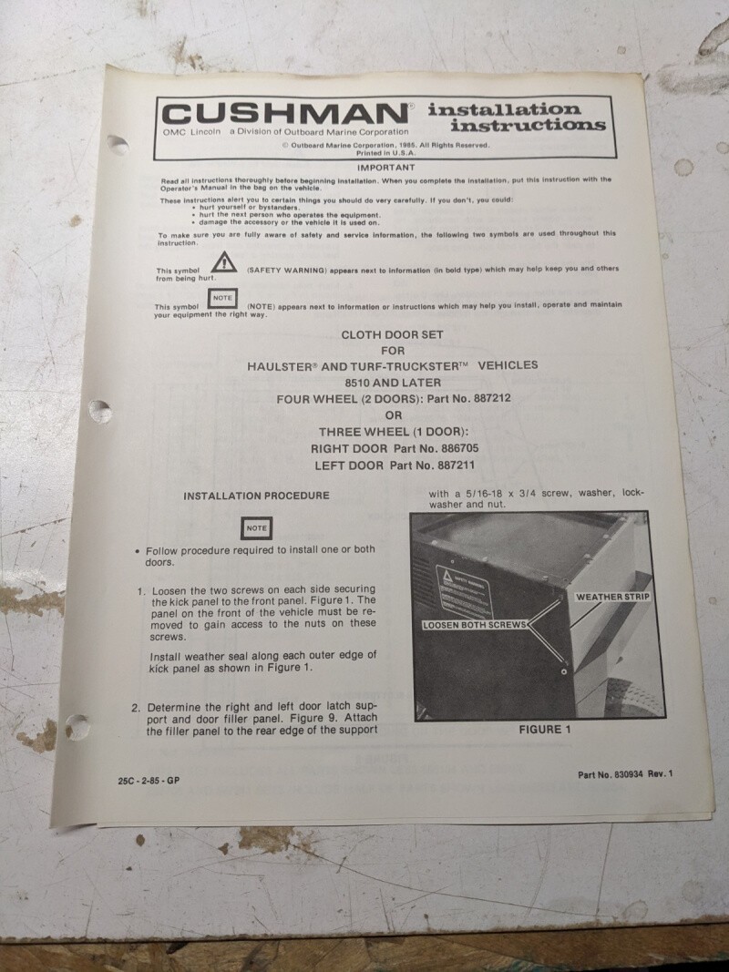 Cushman Installation Instructions Manual Cloth Door Set 887212 886705 1985