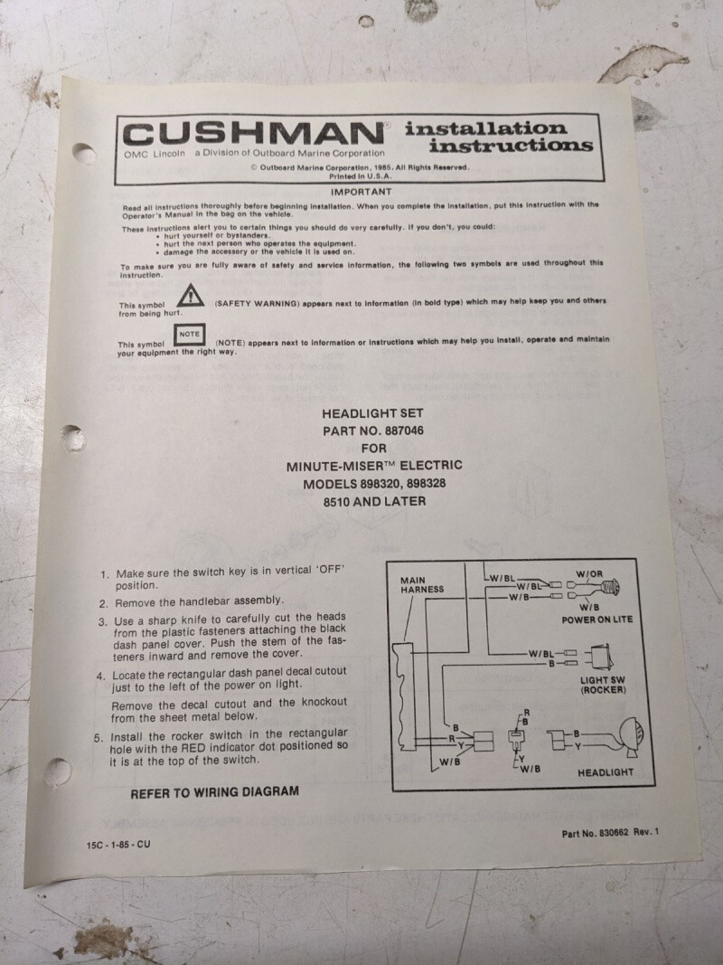 Cushman Installation Instructions Manual Headlight Set 887046 1895 830662