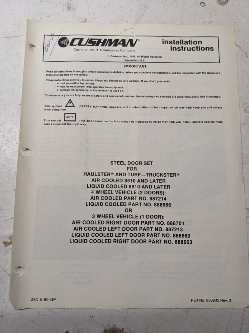 Cushman Installation Instructions Manual Steel Door Set 8510 8910 887214 1990