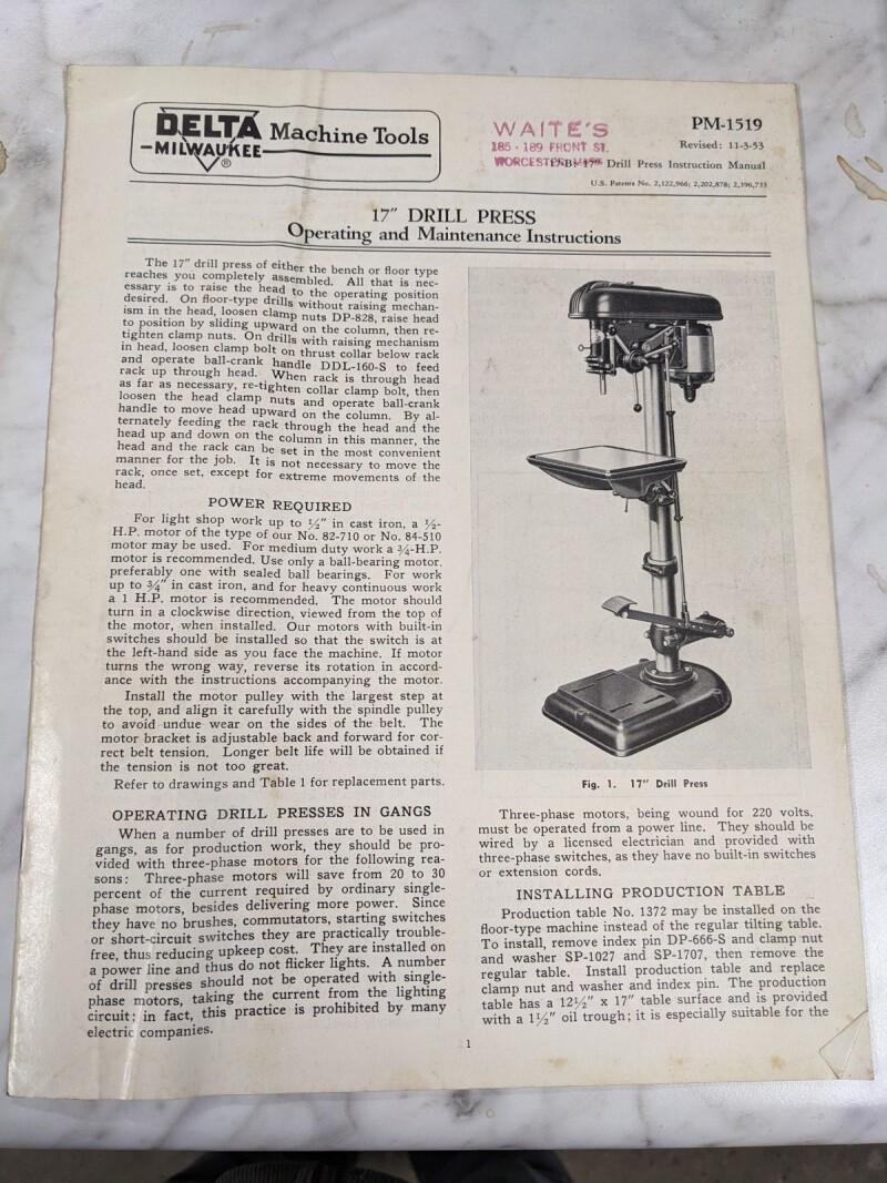 Delta Milwaukee Machine Tool 17” Drill Press Operator Service Manual Parts List