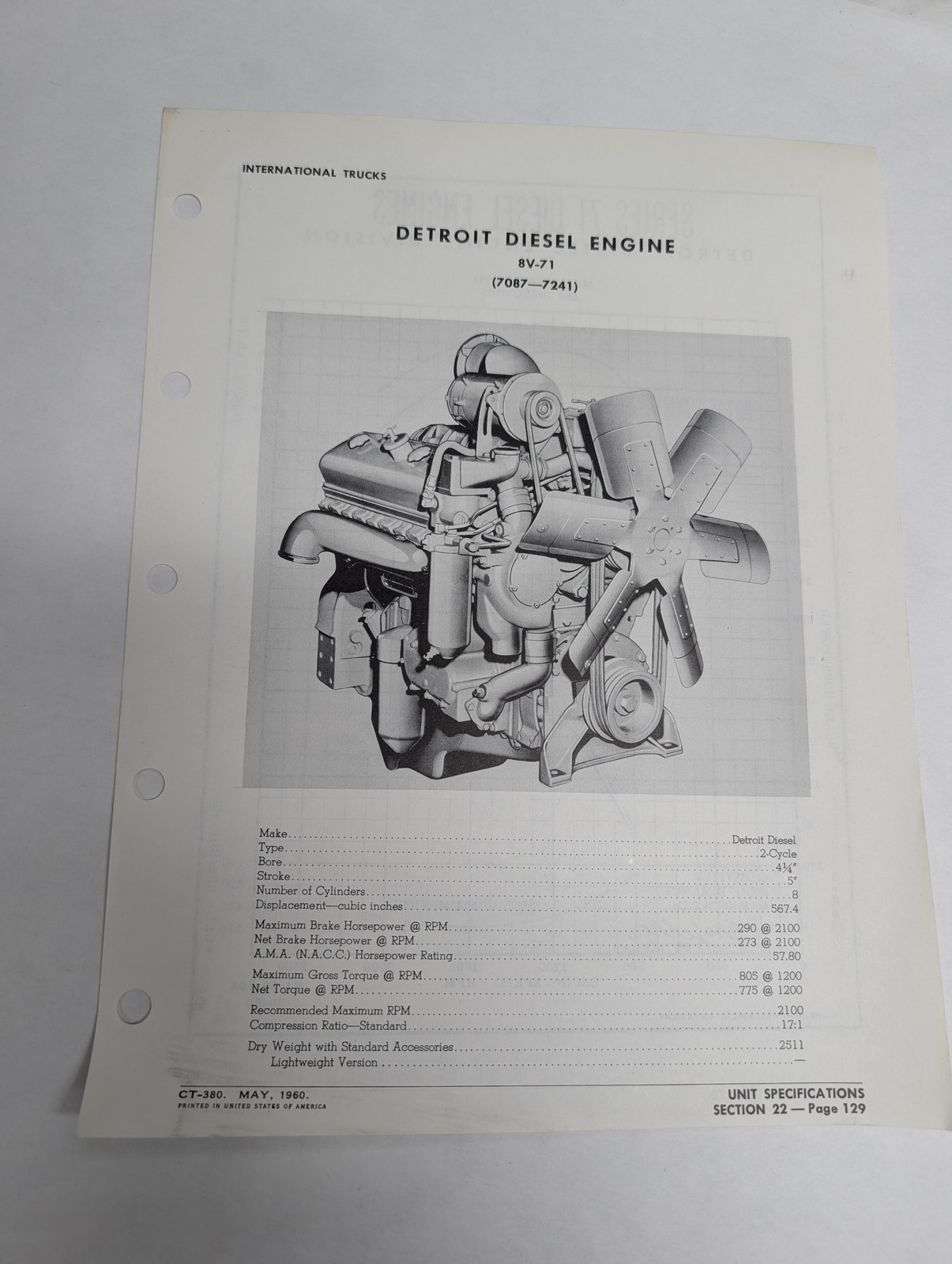 Detroit Diesel Engine Specifications Information Sheet 1960 8V-71 7087-7241
