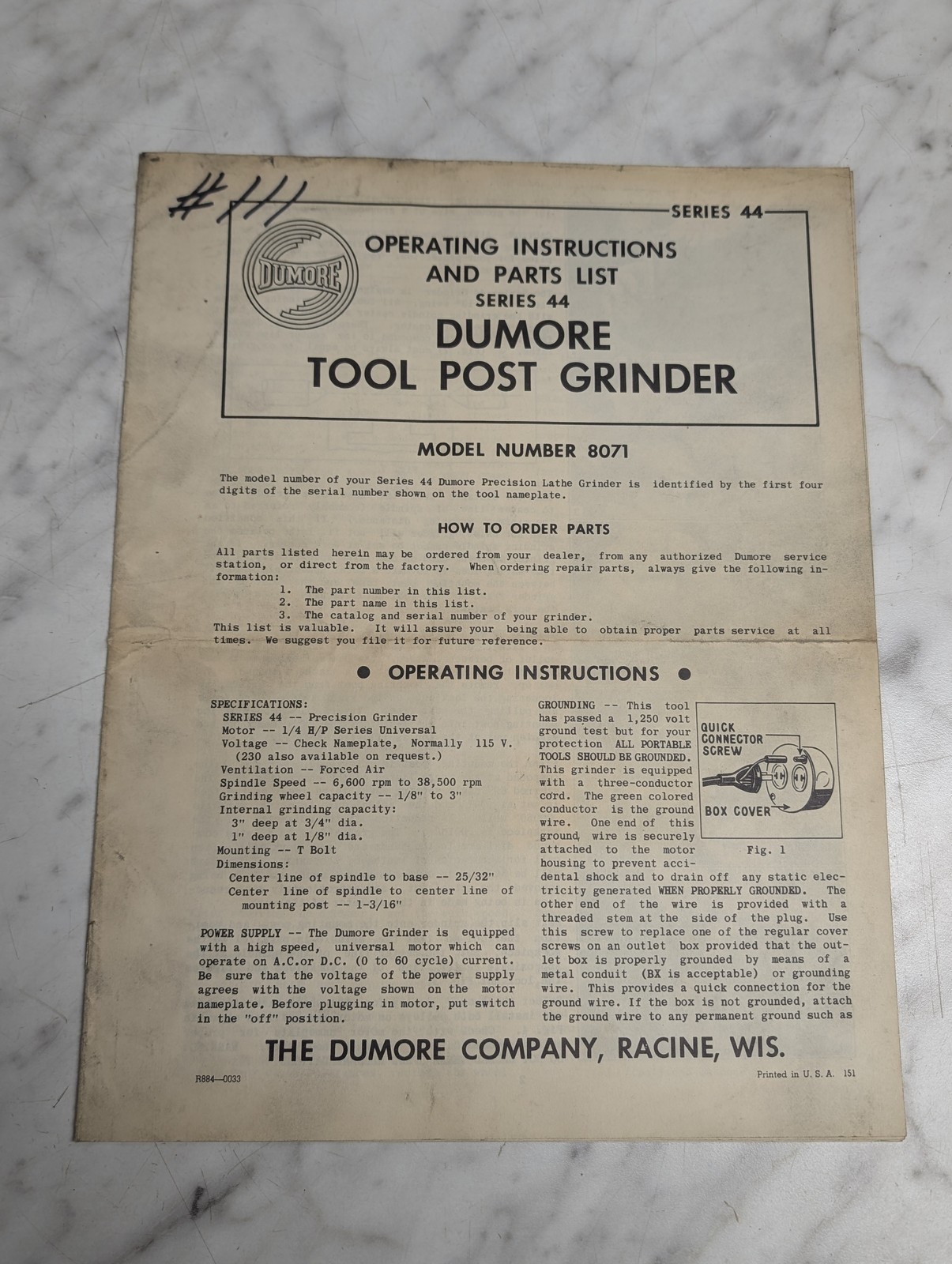 Dumore Operating Instruction Manual Parts List Series 44 Tool Post Grinder 8701