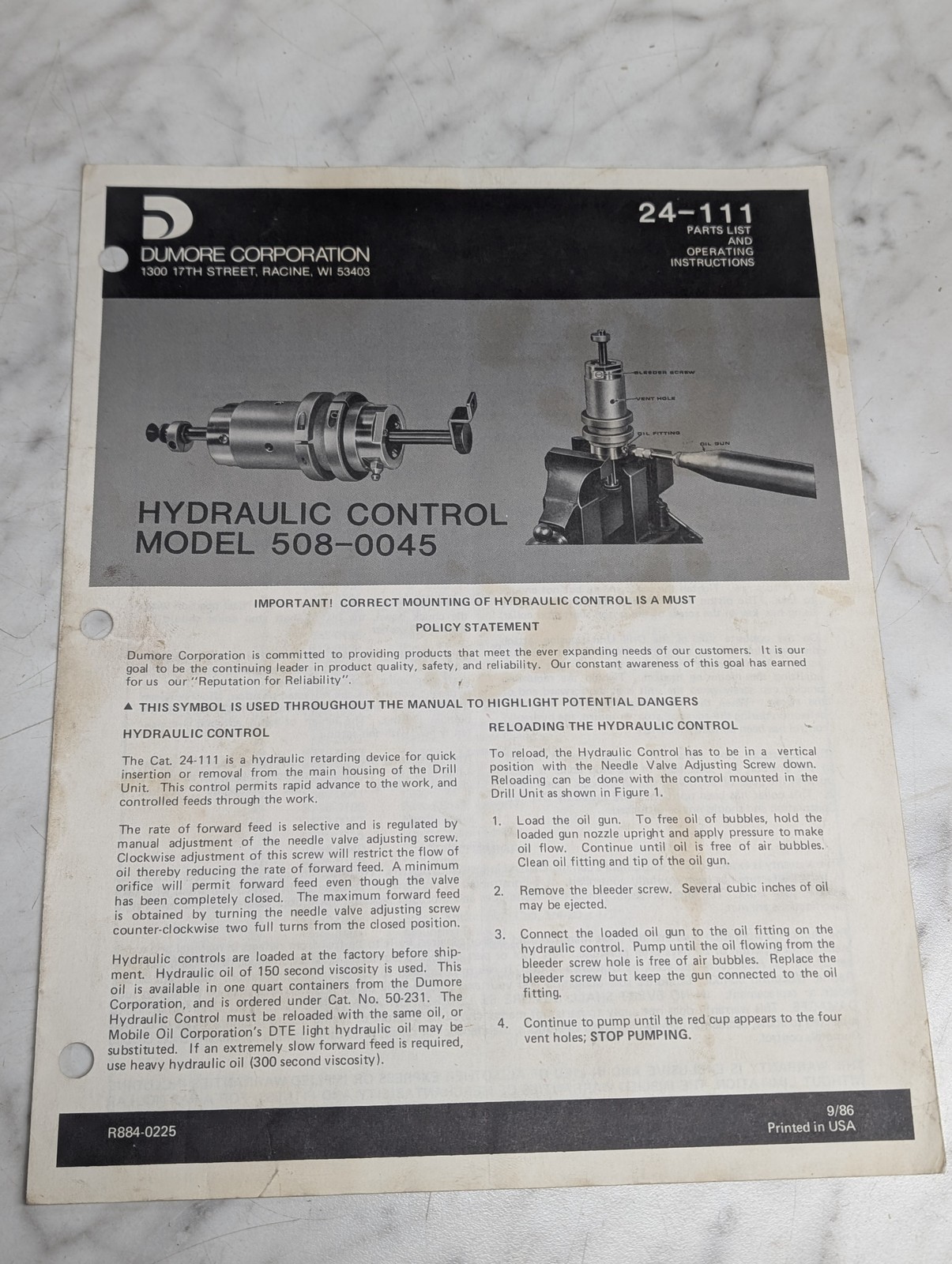 Dumore Operating Manual Parts List Series 24-111 Hydraulic Control 508-0045