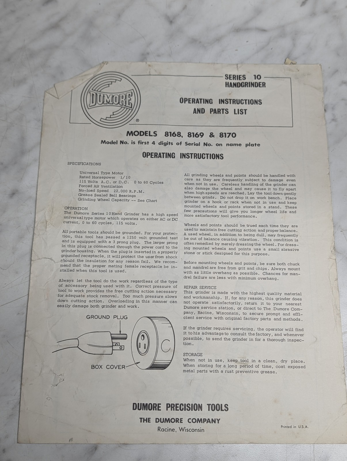 Dumore Operating Owner Manual Parts List Series 10 Handgrinder 8168 8169 8170