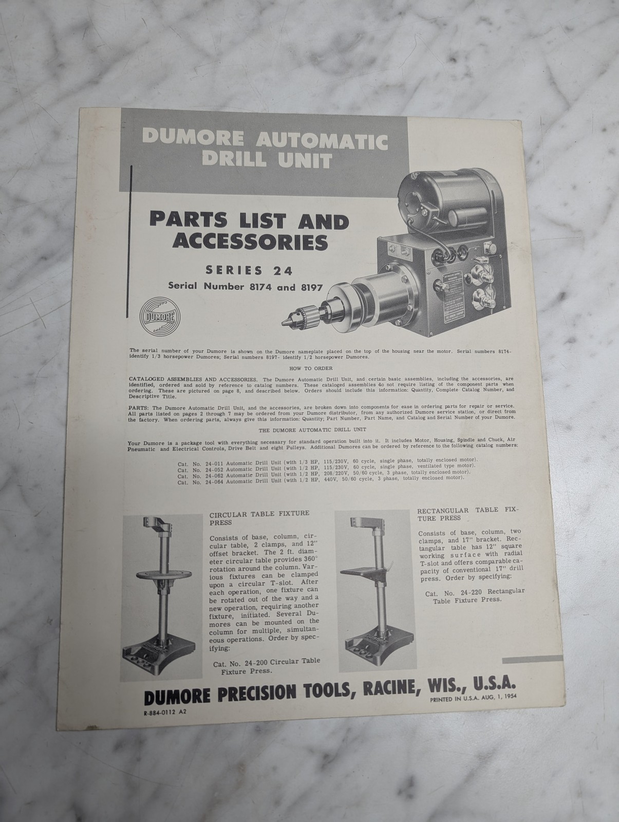 Dumore Operator Instruction Manual Parts List Series 24 Drill Unit 8174 8197