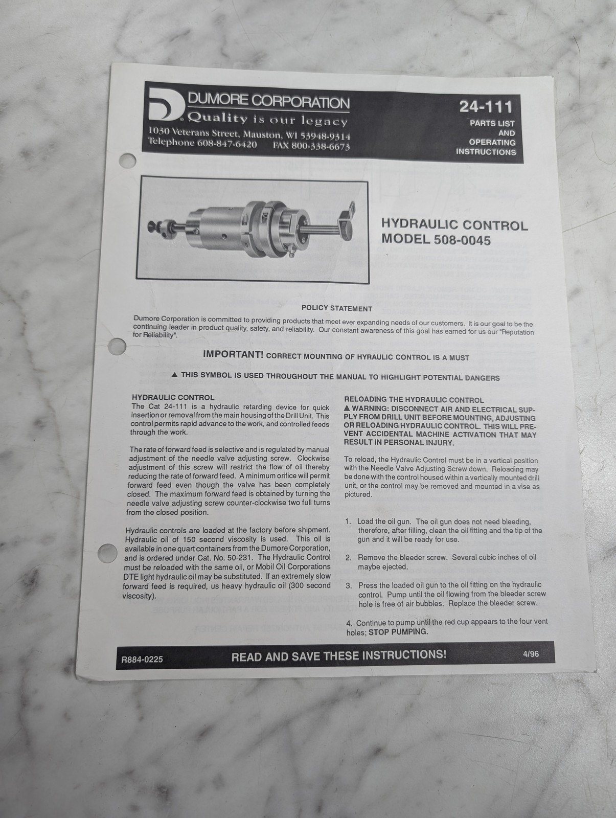 Dumore Parts List Operating Instruction Manual 24-111 Hydraulic Control 508-0045