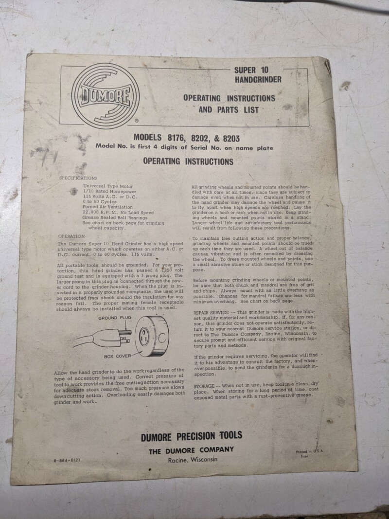 Dumore Super 10 Handgrinder Operating Instruction Parts List 8176 8202 8203