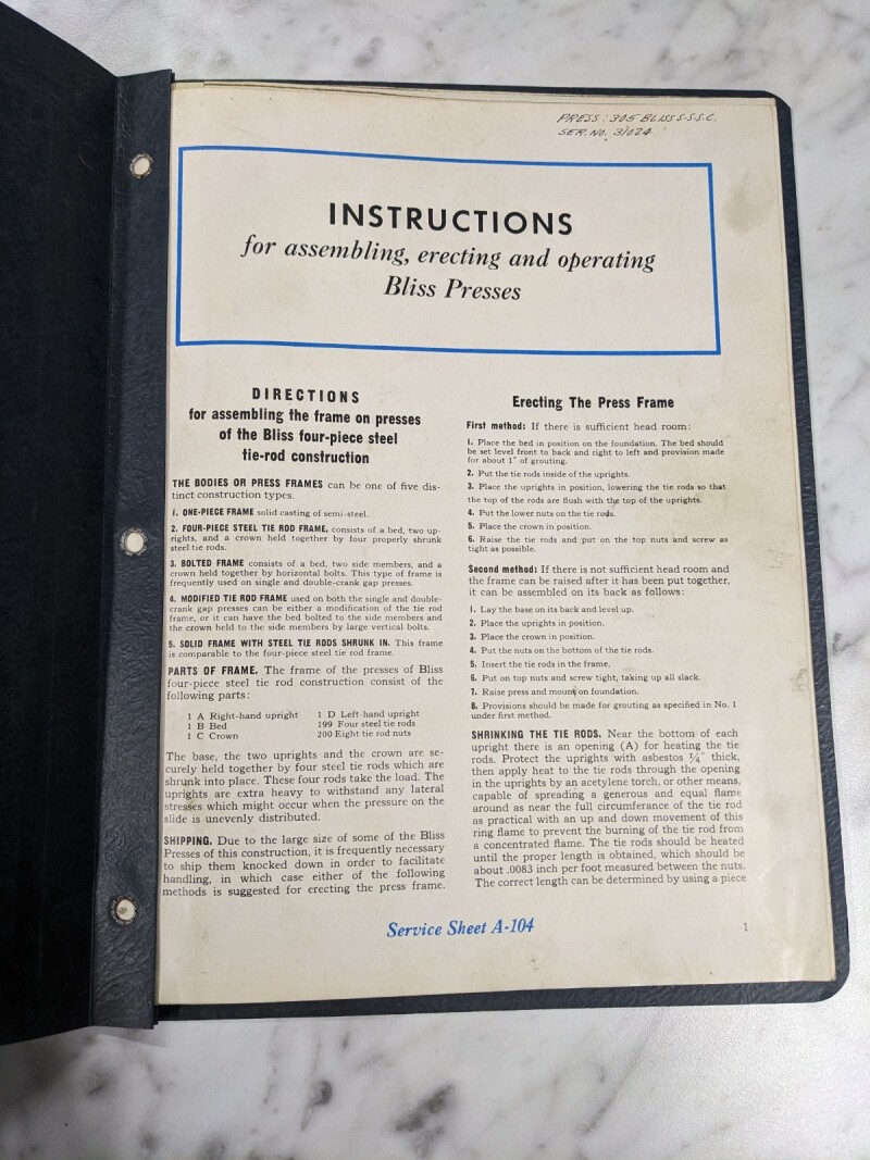 E W Bliss Operator Service Manual Parts List Presses A-104 E B A C D Types 1948