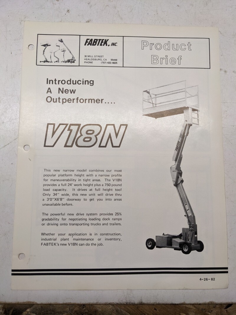 Fabtek Product Brief Sales Brochure V18N Aerial Platform 1982 Features Specs