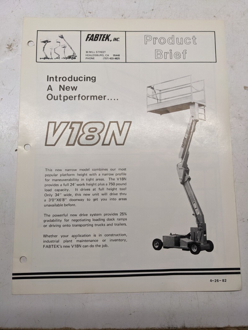 Fabtek Product Brief V18N Aerial Sky Platform Narrow 1982 Sales Advertisment