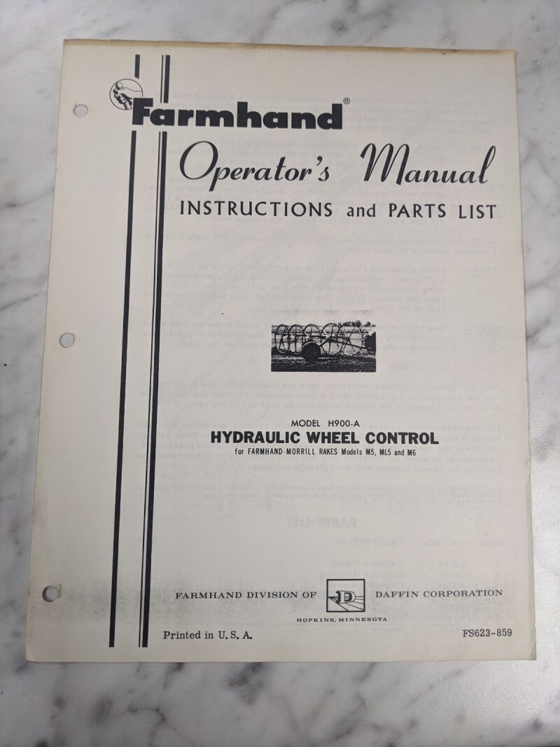 Farmhand Operator Service Manual Parts List Model H900-A Wheel Control