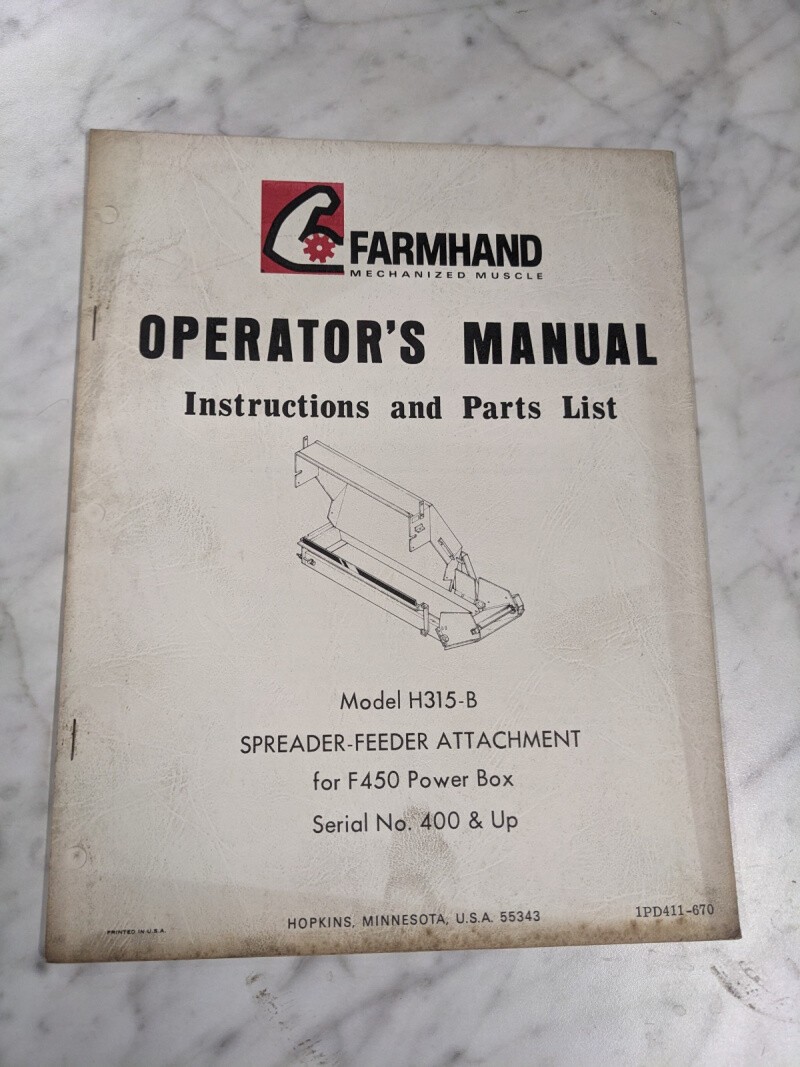Farmhand Operator’S Service Manual Parts List H315-B Spreader Feeder F450 Box